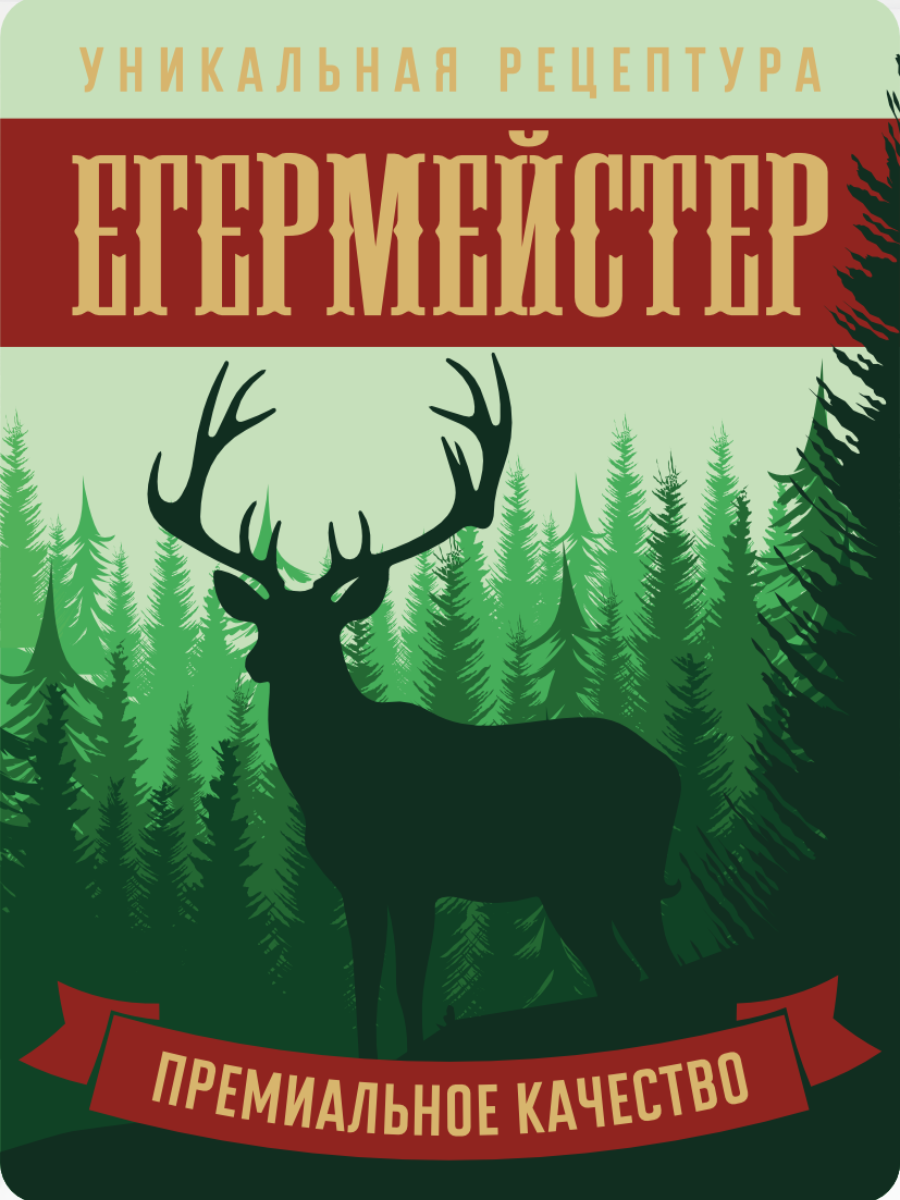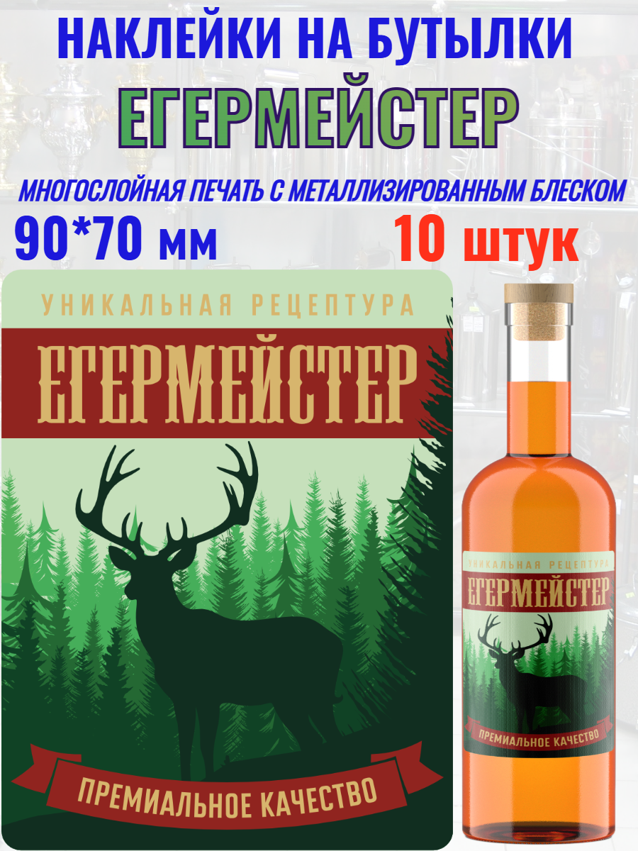Блестящие Наклейки на бутылки и банки ЕГЕРМЕЙСТЕР премиального качества "Егермейстер " выполнены на металлизированной основе с применением многослойной печати. Наклейка блестит при преломлении света от нее, что создает неповторимый визуальный эффект. Дизайн разработан с учетом пожеланий наших покупателей и подходит для абсолютного большинства бутылок, бутылей, банок. Наилучшим образом подходят для напитков на лесных травах, на прозрачных, темных и цветных бутылках. Егермейстер – это крепкая алкогольная настойка с легким ароматом и привкусом лесных трав. Она является разновидностью горьких настоек.