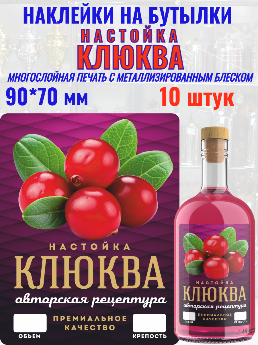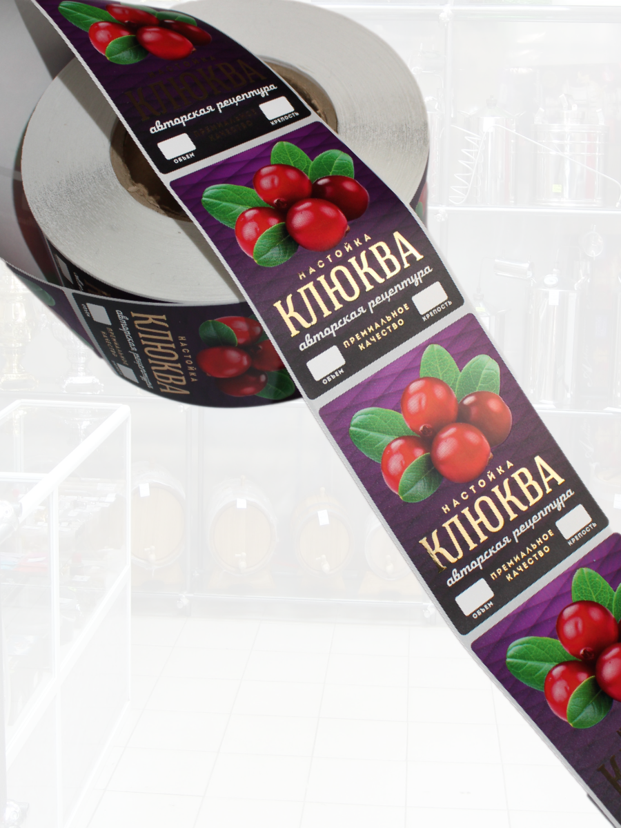 Наклейки на бутылки и банки премиального качества "Настойка Клюква" выполнены на металлизированной основе с применением многослойной печати. Наклейка блестит при преломлении света от нее, что создает неповторимый визуальный эффект. Дизайн разработан с учетом пожеланий наших покупателей и подходит для абсолютного большинства бутылок, бутылей, банок. Наилучшим образом подходят для любых напитков - настойки из клюквы на прозрачных, темных и цветных бутылках.