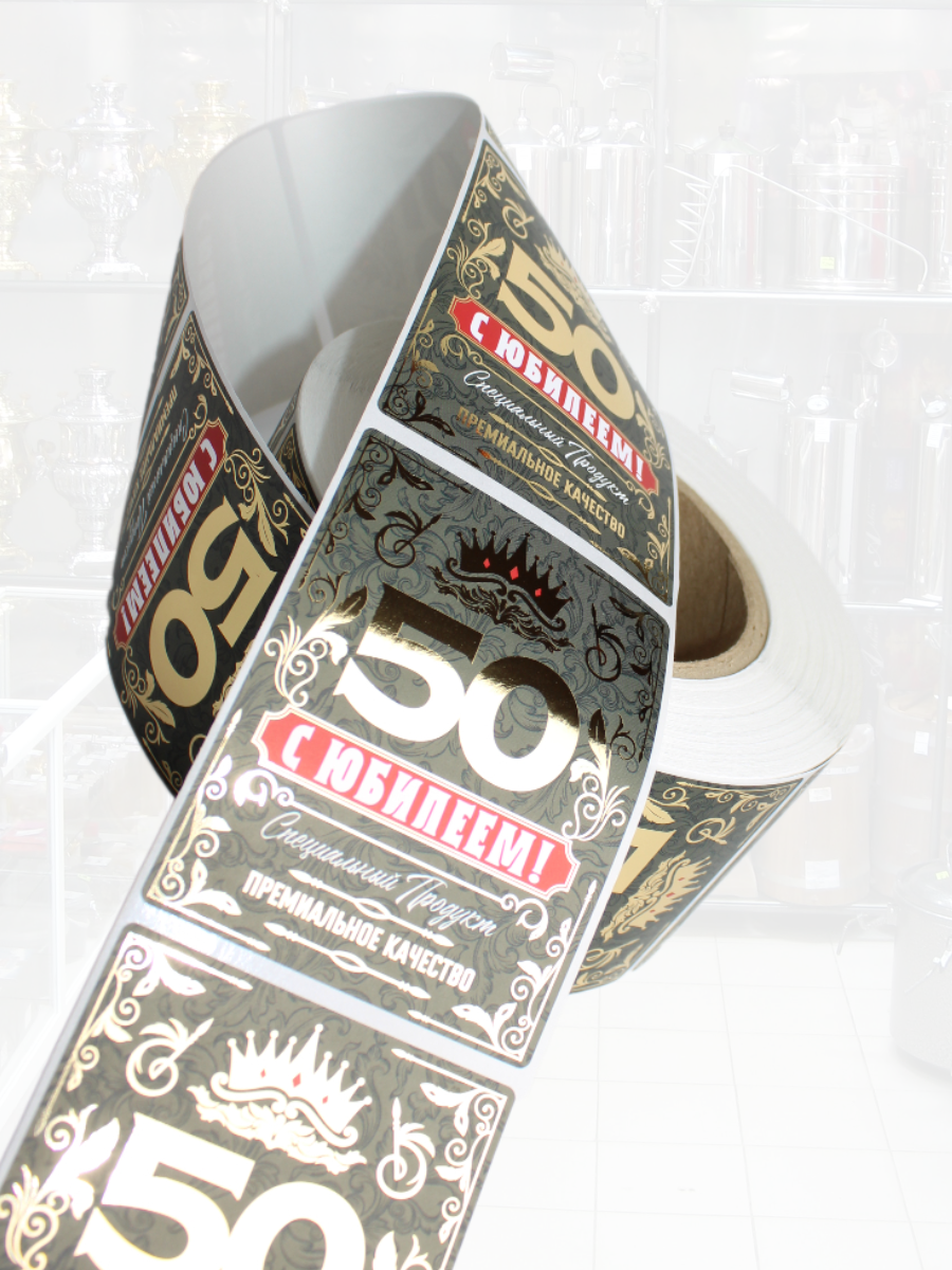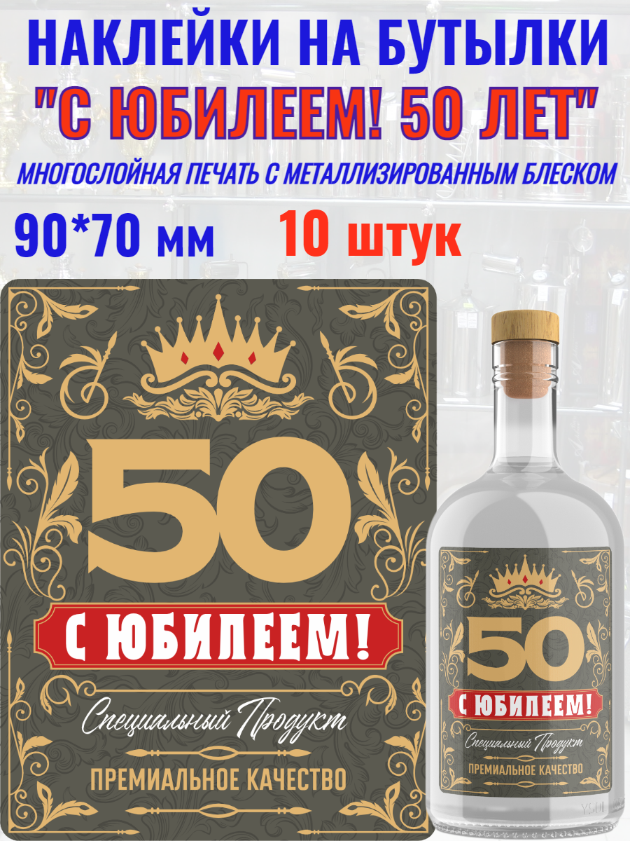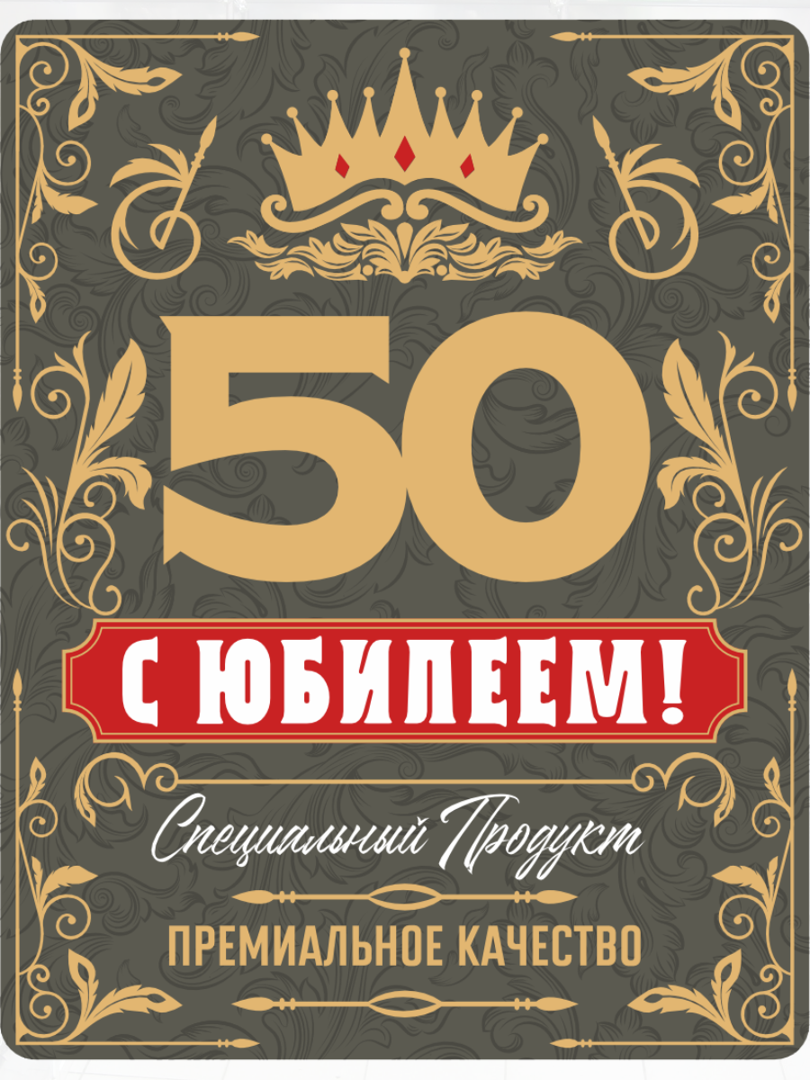 Наклейки на бутылку и подарок премиального качества "С Юбилеем 50 лет!" выполнены на металлизированной основе с применением многослойной печати. Дизайн разработан с учетом пожеланий наших покупателей и подходит для абсолютного большинства бутылок, бутылей, банок и подарков. Наилучшим образом подходят для любых напитков на прозрачных, темных и цветных бутылках, упаковки подарков для мужчин и женщин. Цвет и графика раскрываются в полной мере при наполнении бутылки вашим любимым напитком - контрастность увеличивается. Металлизированные вставки (шрифты и элементы рисунка) переливаются при преломлении света от них. Проходя мимо бутылки или подарка с такой наклейкой она будет давать золотистый металлизированный отблеск.